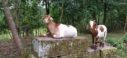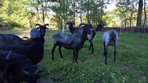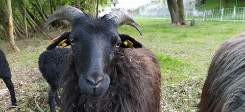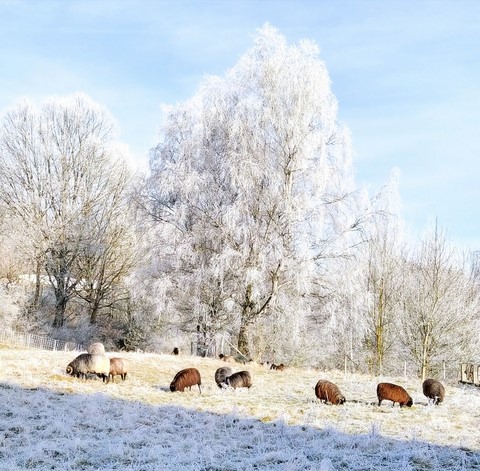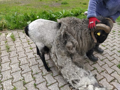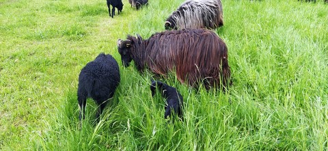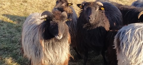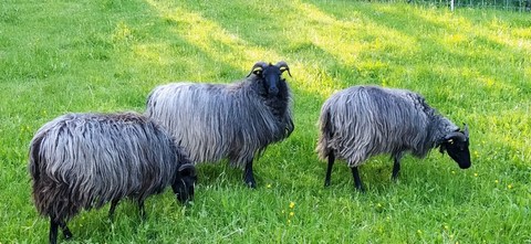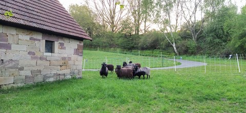 Auf den Wiesen grasen Schafe der Rasse Graue Gehörnte Heidschnucke. Im Frühjahr fällt beim Scheren Wolle an, die wir auf Anfrage abgeben (zur Wollgewinnung, Düngung, Dämmung, etc.).